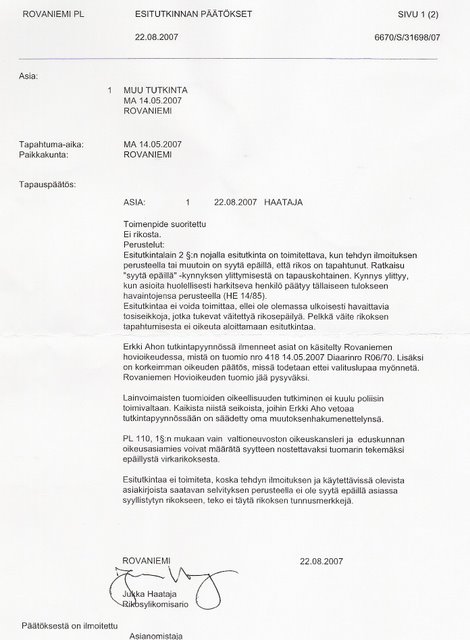 Rovaniemen poliisin rikosylikomisario Jukka Haatajan esitutkintapäätös 22.08.2007